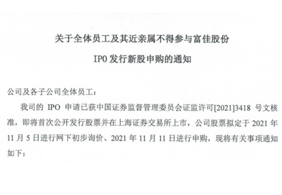 關(guān)于全體員工及其親近不得參與富佳股份IPO發(fā)行新股申購(gòu)的通知